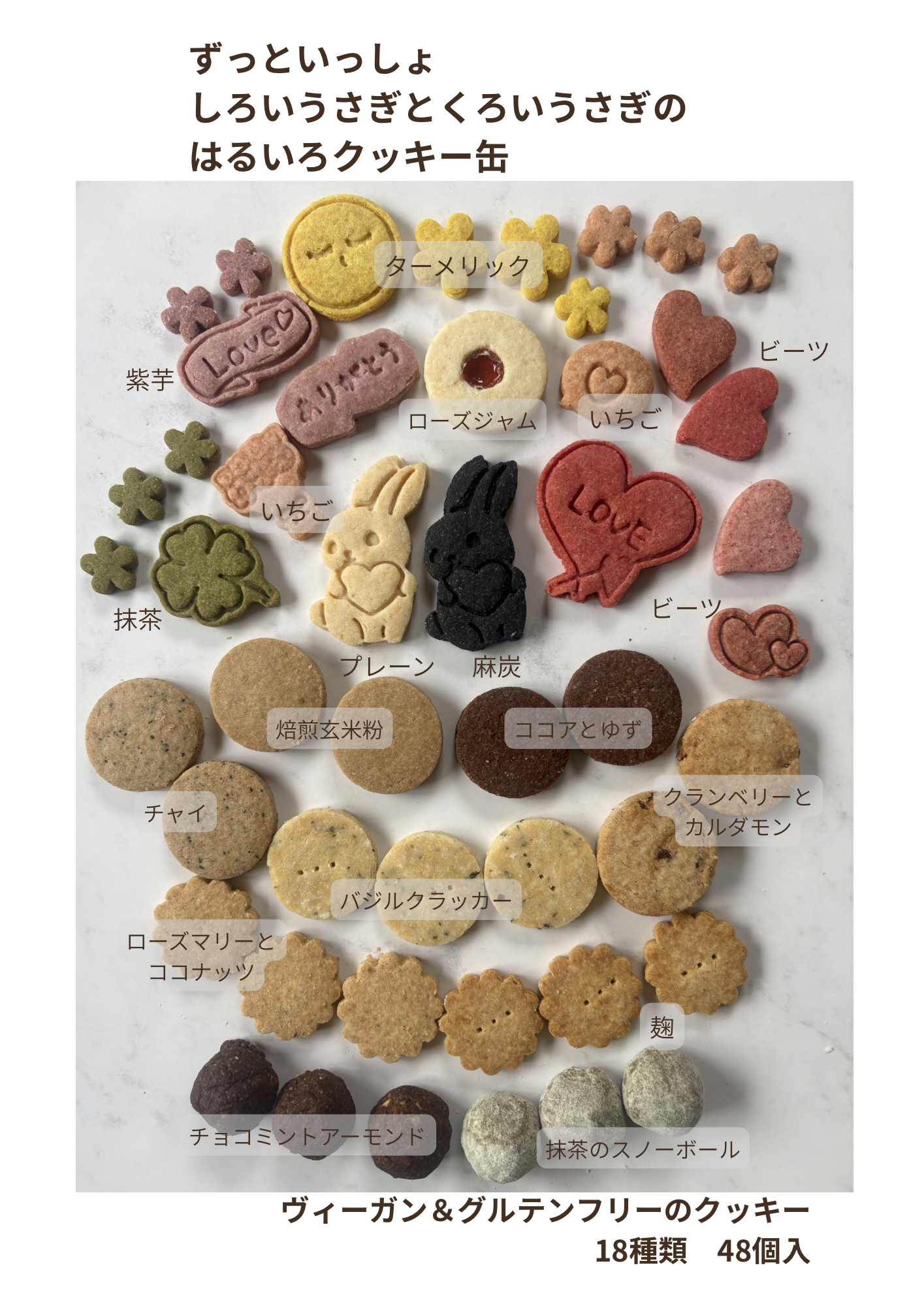 グルテンフリー&ヴィーガン仕様のクッキーで表現しました。